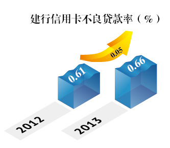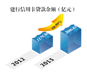 在信贷额度上,截至2013年末,建行信用卡贷款余额有较大幅度的增长(见图二),在整个信贷额度上的占比从2.37%提升至3.13%。