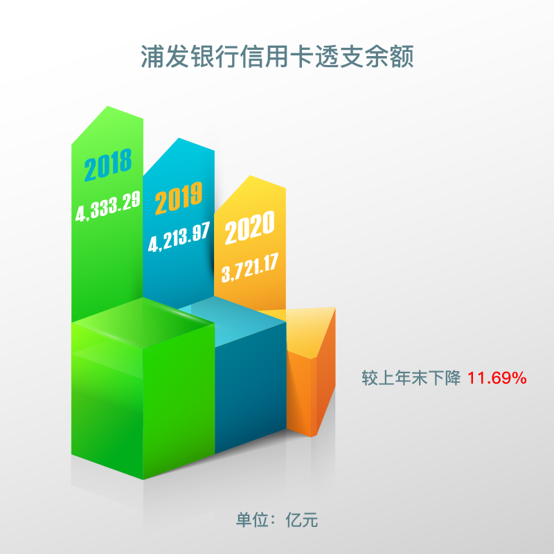 截至2020年末,浦发银行信用卡透支余额为3,721.17亿元,较上年末下降 11.69%;截至2019年末浦发银行信用卡透支余额为4,213.97亿元;截至2018年末浦发银行信用卡透支余额为4,333.29亿元。