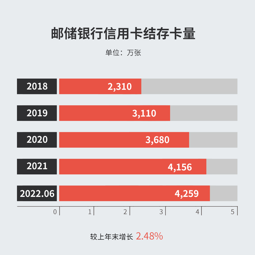 截至2022年6月末,邮储银行信用卡结存卡量4,258.93万张,较上年末增长2.48%,上半年新增发卡330.81万张。