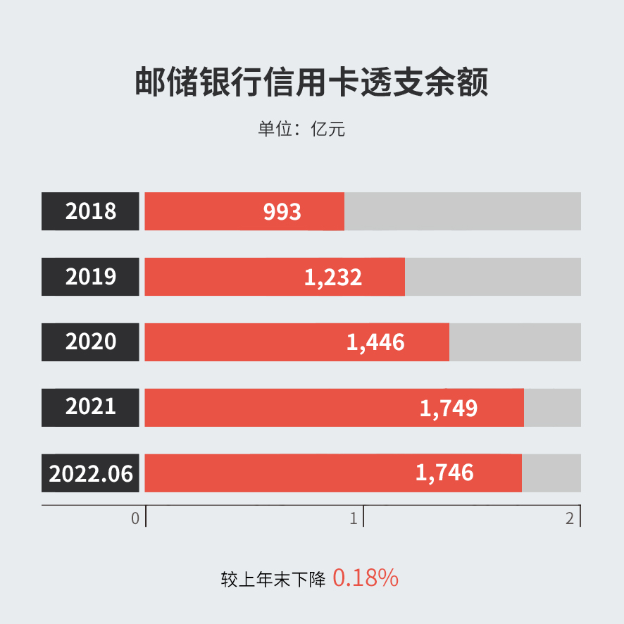 截至2022年6月末,邮储银行信用卡信贷余额1,745.55亿元,较上年末下降0.18%。