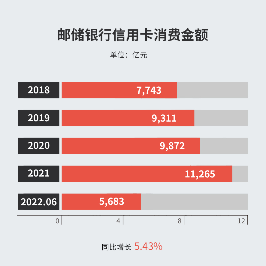 2022年上半年,邮储银行信用卡消费金额5,682.61亿元,同比增长5.43%。