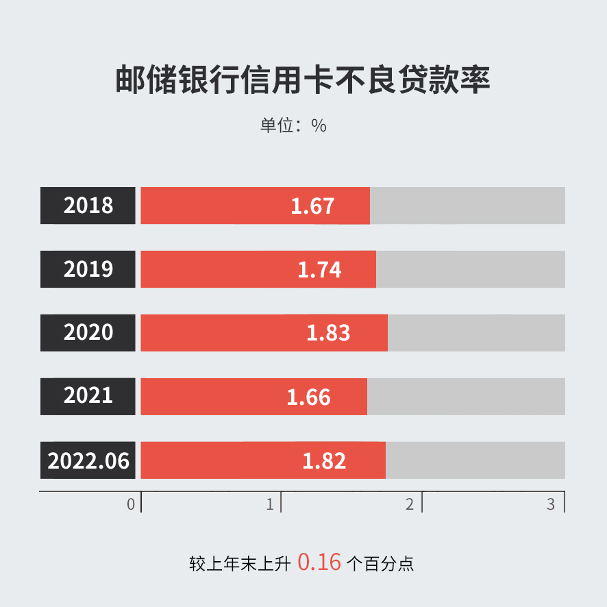 截至2022年6月末,邮储银行信用卡不良贷款率为1.82%,较上年末上升0.16个百分点。