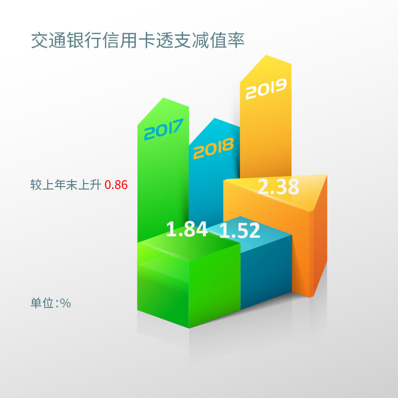 截至报告期末,交通银行信用卡透支减值率为2.38 %,较上年末上升0.86%,截至2018年末交通银行信用卡透支减值率为1.52%,截至2017年末交通银行信用卡透支减值率为1.84%。
