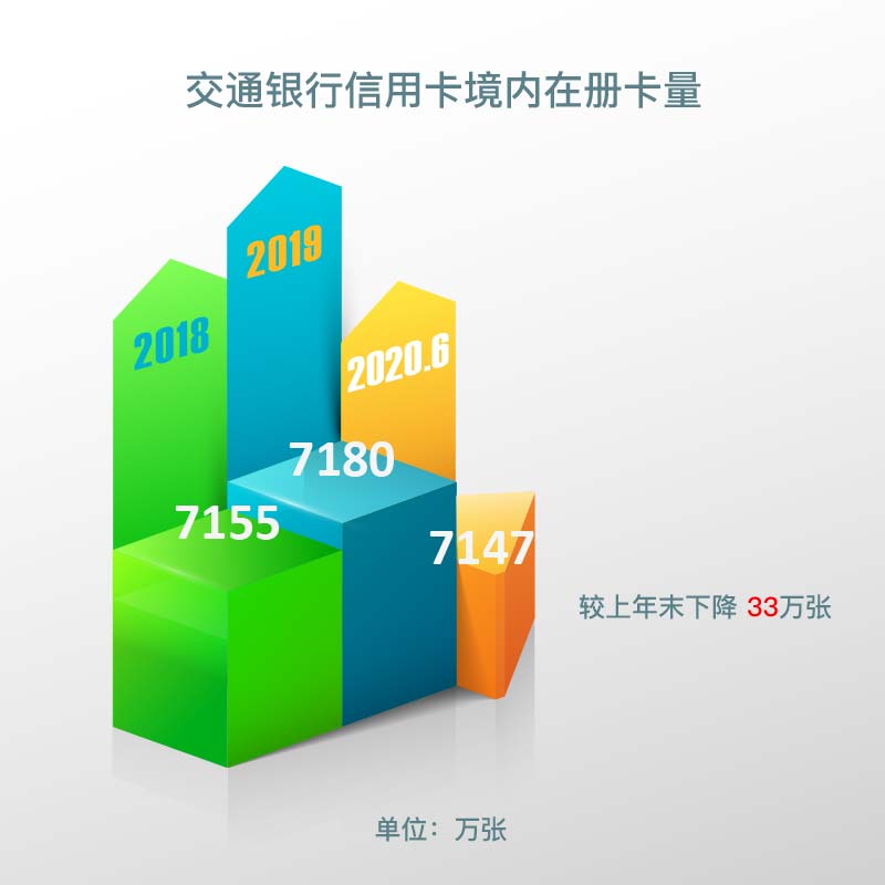 截至报告期末,交通银行境内行信用卡在册卡量达7,147万张,较上年末下降33万张;截至2019年末交通银行信用卡在册卡量7,180万张,截至2018年末交通银行信用卡在册卡量7,155万张。