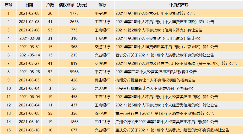 截至7月5日,据银登中心官网公告信息显示,已有工商银行、平安银行、交通银行、兴业银行、农业银行、民生银行7家银行共计15个个人不良贷款资产包在银登中心刊登了招商公告/挂牌公告。