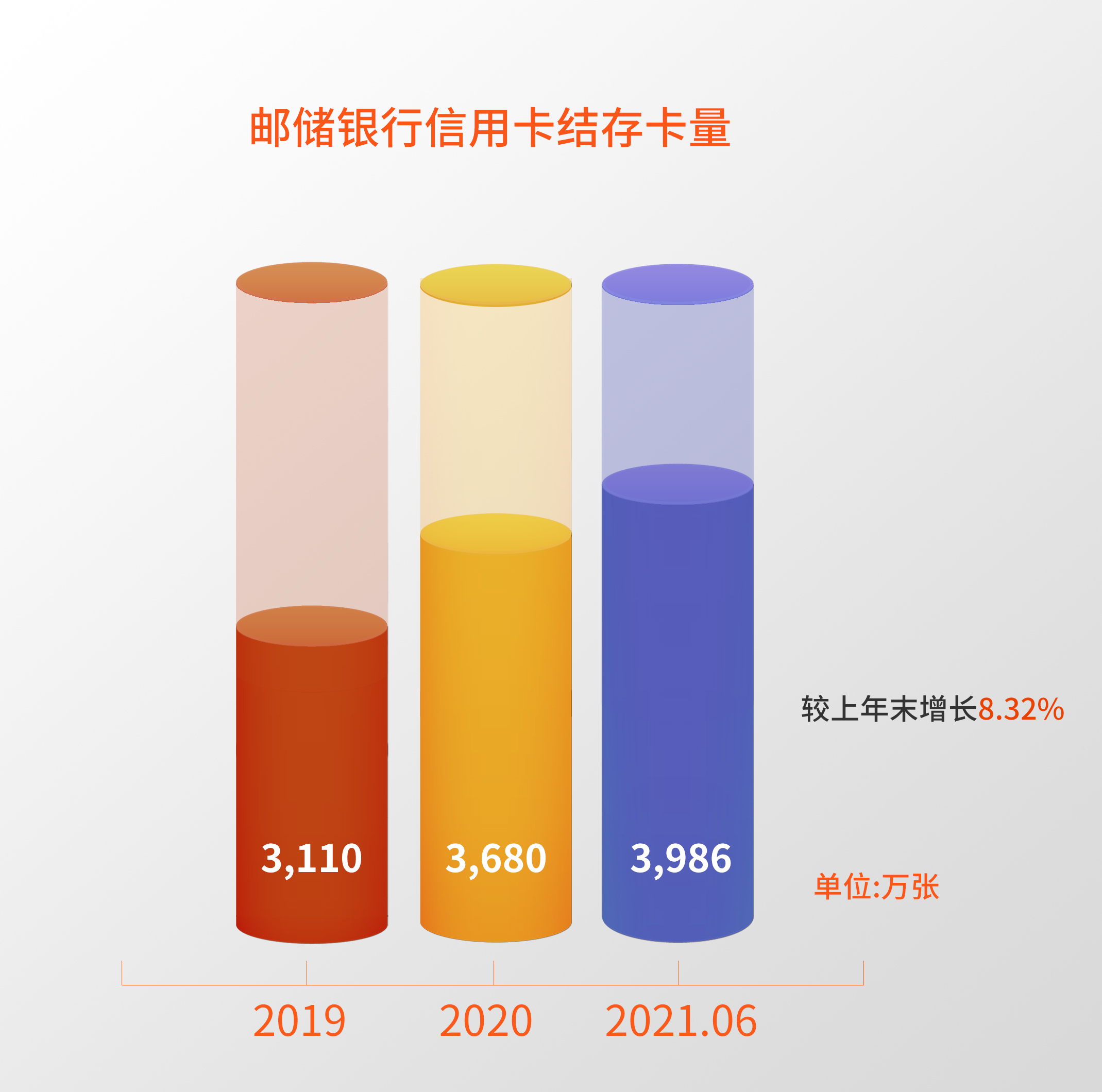 截至2021年6月末,邮储银行信用卡新增发卡466.97万张,结存卡量达到3,985.91万张,较上年末增长8.32%。