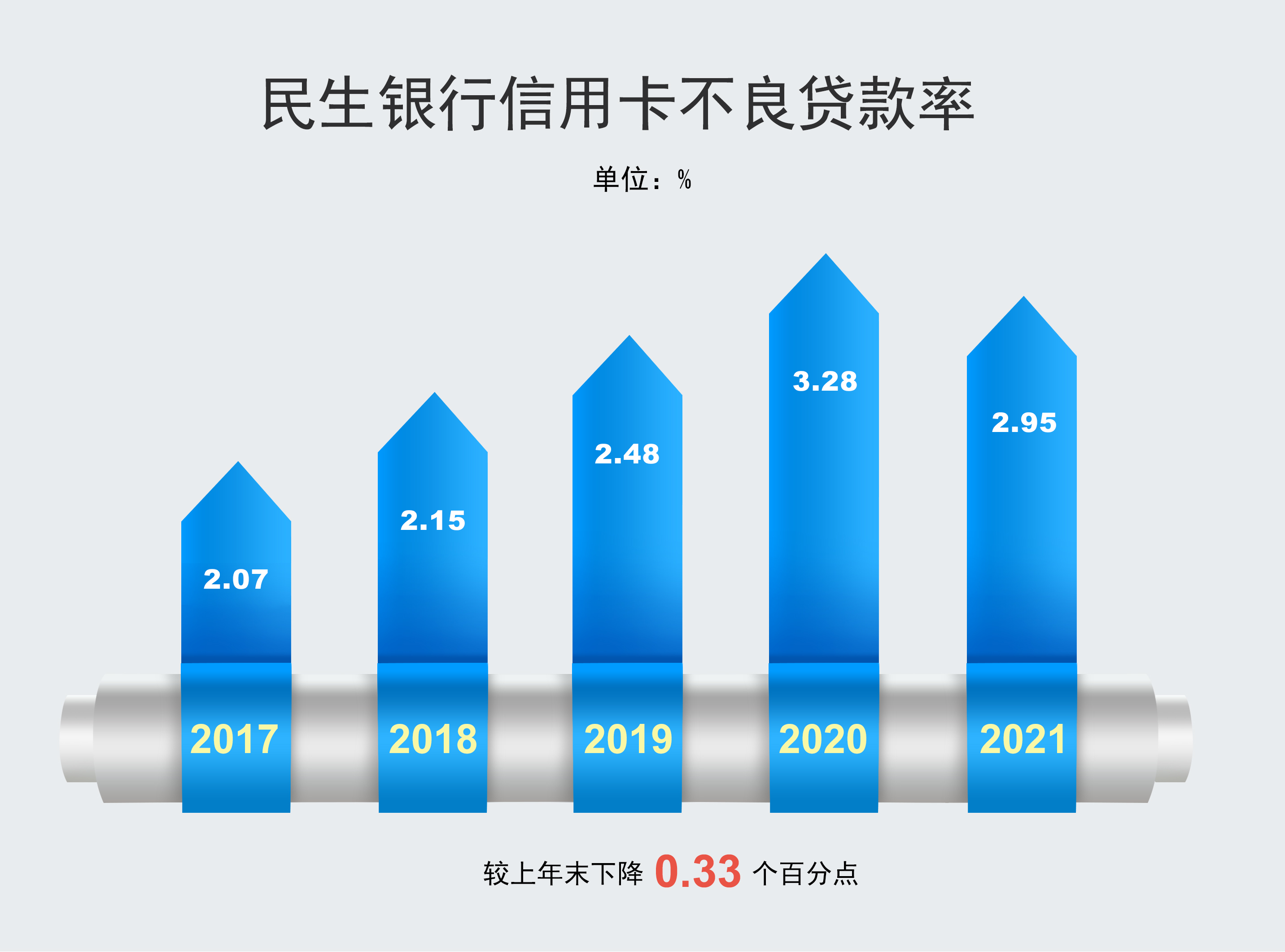 截至2021年末,民生银行信用卡不良贷款139.24亿元,较上年末减少12.56亿元;不良贷款率2.95%,较上年末下降0.33个百分点。