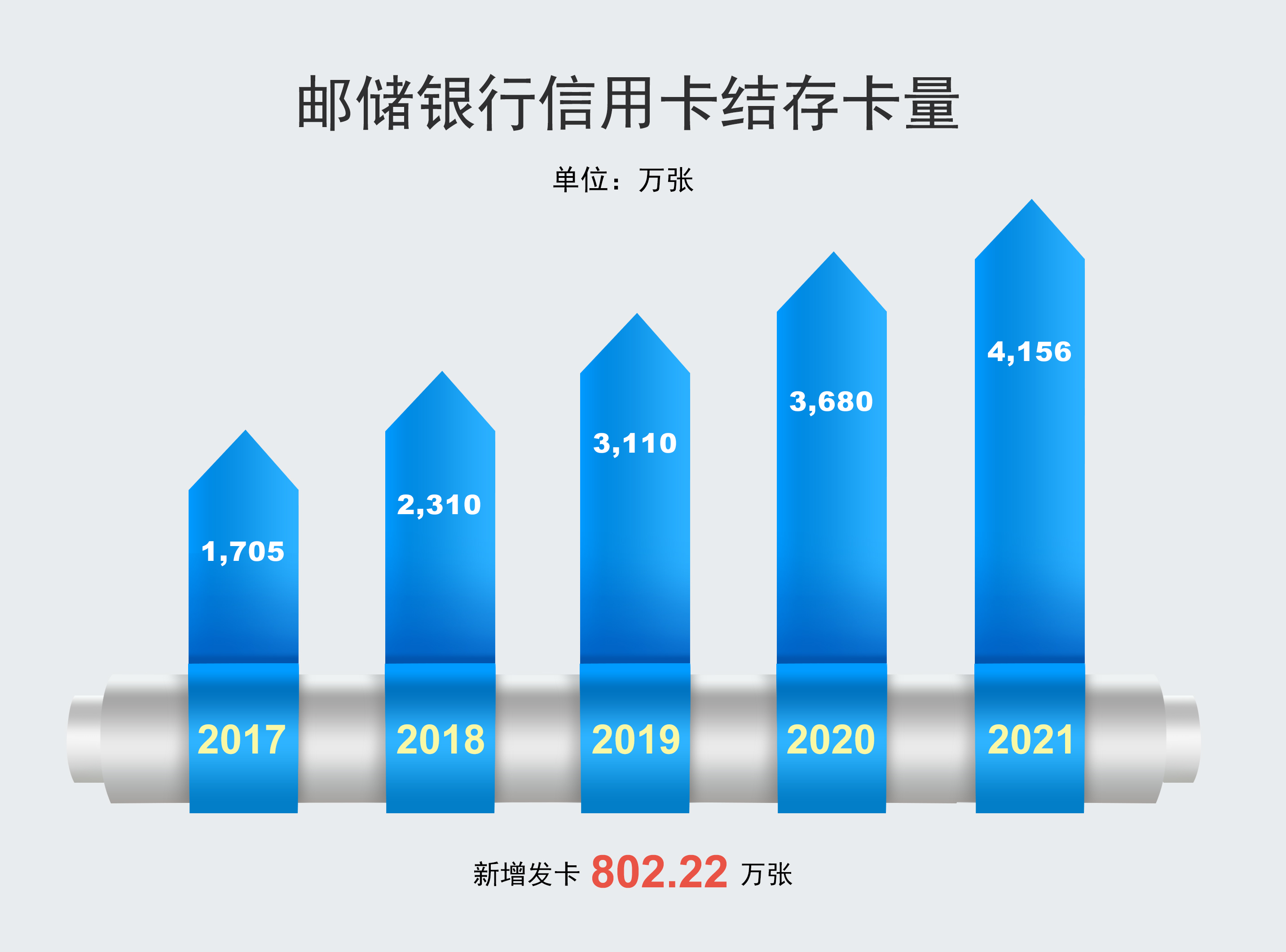 截至2021年末,邮储银行信用卡结存卡量4,155.87万张,较上年末增长12.93%,当年新增发卡802.22万张。