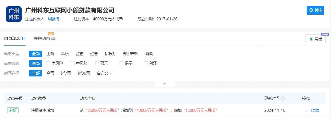 一方面,对联手收购的网络小贷牌照——广州科东互联网小额贷款有限公司(下称“科东小贷”)进行了1.5亿元增资,注册资本增加至4亿元。