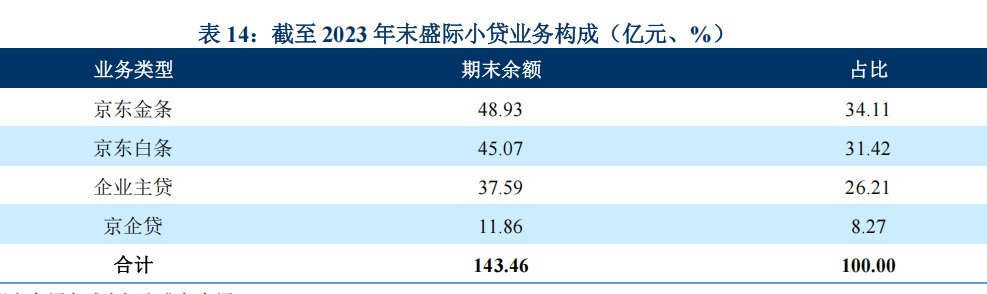 图表为京东盛际小贷2023年末的业务构成(亿元、%)