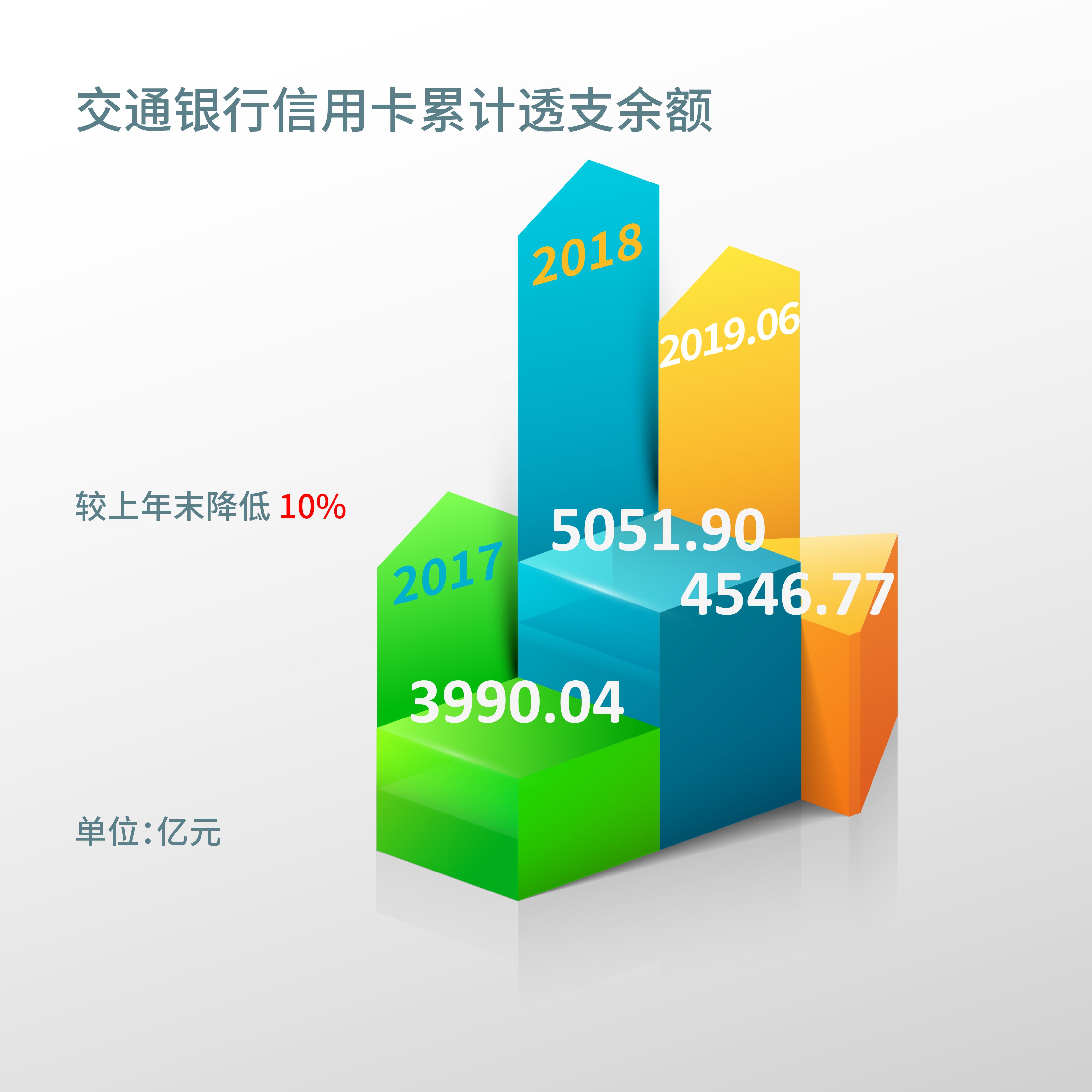 截至报告期末,交通银行信用卡累计透支余额4,546.77亿元,较上年末降低10%,据往年年报显示,截至2018年末,该行信用卡累计透支余额5051.90亿元,截至2017年末,该行信用卡累计透支余额3990.04亿元。