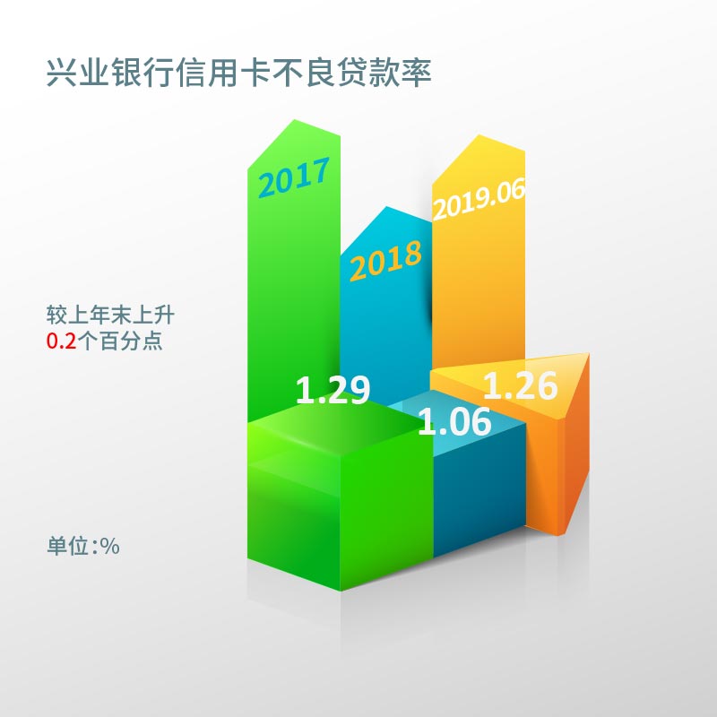 截至报告期末,兴业银行信用卡不良贷款率为1.26%,较上年末上升 0.2 个百分点,据往年年报显示,截至2018年末信用卡不良贷款率为1.06%,截至2017年末信用卡不良贷款率为1.29%。