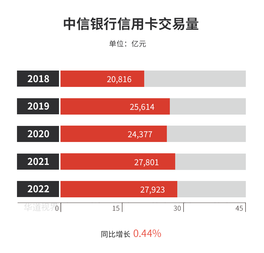 2022年,中信银行信用卡交易量27,922.63亿元,同比增长0.44%;