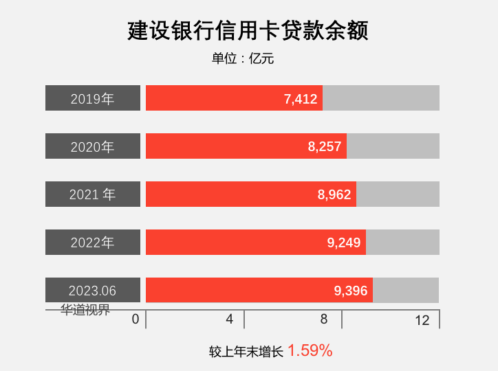 截止2023年6月末,建设银行信用卡贷款余额9,395.96 亿元,较上年末增幅 1.59%;