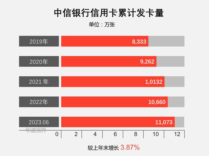 截至2023年6月末,中信银行信用卡累计发卡11,072.52万张,较上年末增长3.87%;