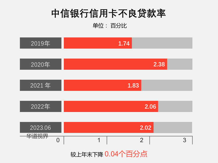 截至2023年6月末,中信银行信用卡不良率2.02%,较上年末下降0.04个百分点;不良贷款余额104.73亿元,较上年末减少0.48亿元;