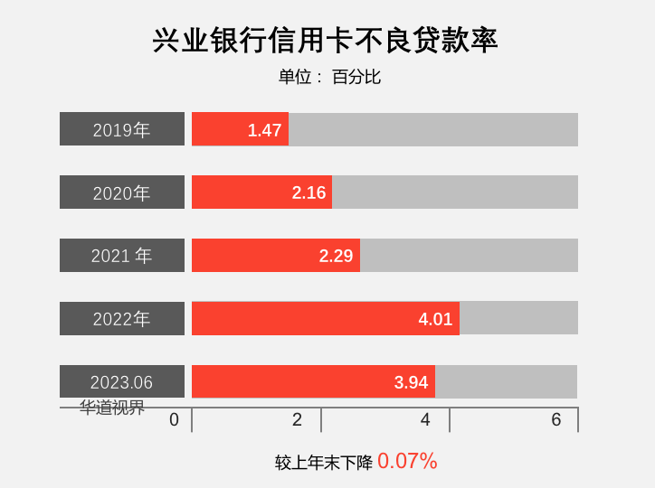 截至报告期末,兴业信用卡不良率3.94%,较上年末下降0.07个百分点。