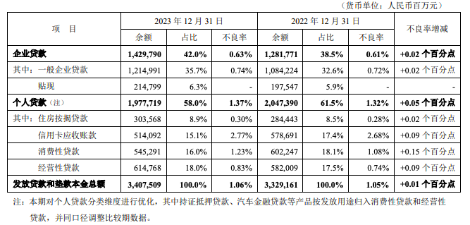截止2023年末,平安银行信用卡不良率为2.77%,较上年末上升0.09个百分点;