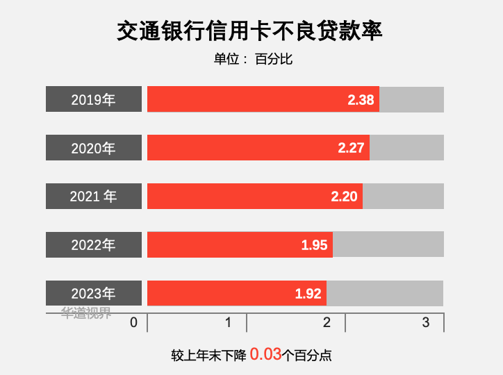 截至2023年末,交通银行信用卡不良率 1.92%,较上年末下降 0.03 个百分点,持续四年保持下降趋势。