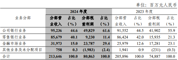 零售金融业务收入为856.79亿元,较上一年微降0.86%,占比 40.1%,税前利润92.30亿元,较上一年下降42.08%,占整体利润总额的11.4%。