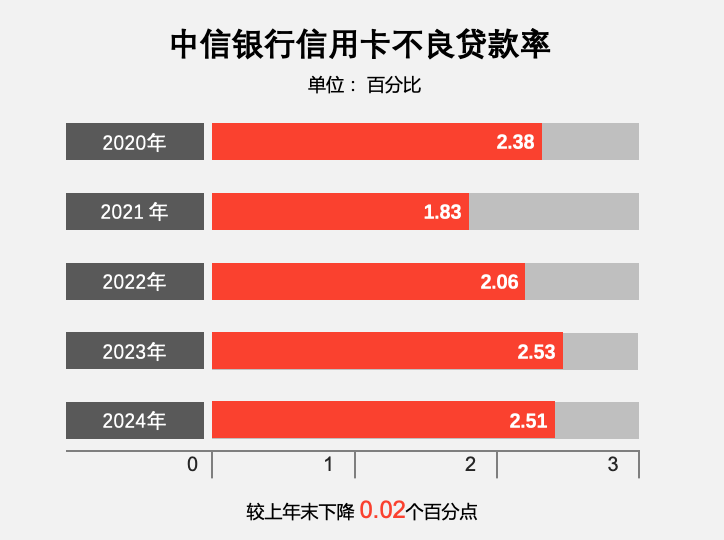截至2024年末,中信银行信用卡不良率2.51%,较上年末下降0.02个百分点;