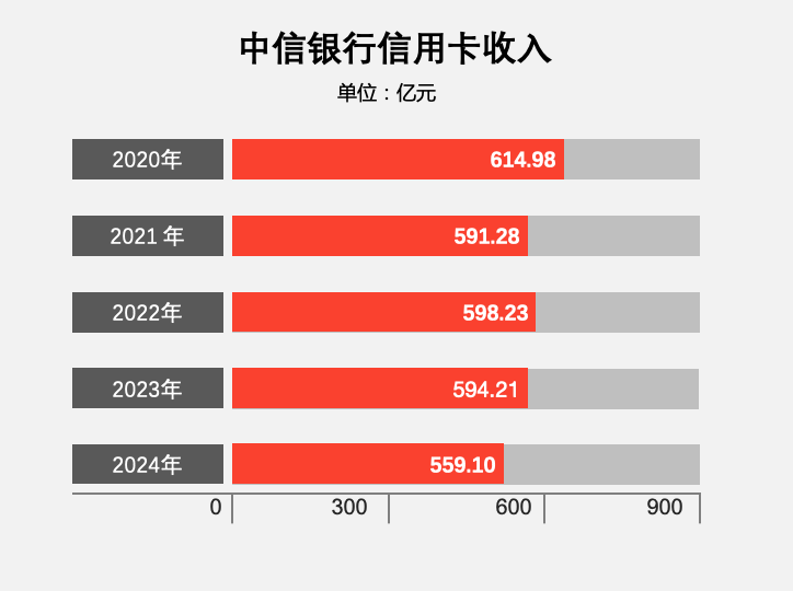2024年,中信银行信用卡实现业务收入 559.10 亿元,同比下降 5.91%。