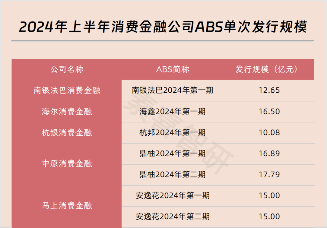 而根据作者统计,2024年上半年,共有5家消费金融公司发行了超百亿规模的ABS,分别为马上消费金融、中原消费金融、杭银消费金融、海尔消费金融、南银法巴消费金融,各消金公司及其发行次数、发行规模的统计如下图所示: