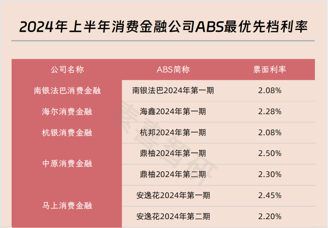 既然存在信用分层,那么对应的利率也会存在相应分层。由于次级档通常无票面利率,因此优先级资产的对比更具意义。作者统计发现,2024年上半年,杭银消费金融与南银法巴消费金融在优先档拿下了最低利率2.08%,所涉规模分别为7.52亿元、9.5亿元: