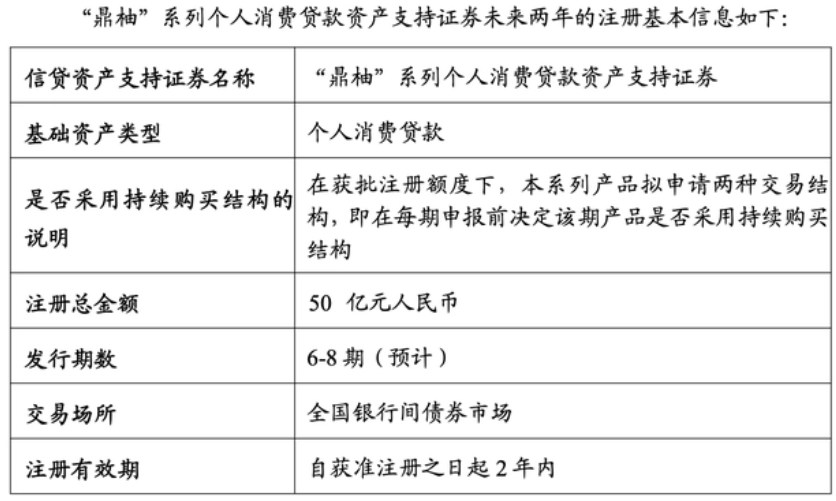 此后,需申请证券代码、实施备案登记,随后在银行间市场挂牌发行。值得一提的是,持牌消费金融多采取储架式发行,例如中原消费金融曾发布《“鼎柚”系列个人消费贷款资产支持证券的注册申请报告》: