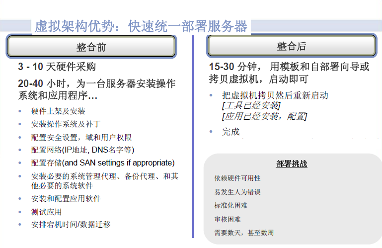 另外,虚拟化平台在快速统一部署服务器方面同样具有极大的优势,所需周期由原来的10-15天缩短至2小时内;同时,通过虚拟化平台的快照、备份和恢复等技术,维护了系统和数据的安全与稳定,稳健保障业务实时、安全交付。