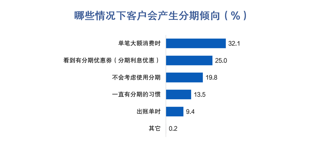 32%的受访者表示,在单笔大额消费时会产生分期意愿。这表明当客户有大额消费时,实时进行分期营销的效果优于出账单时再进行营销。