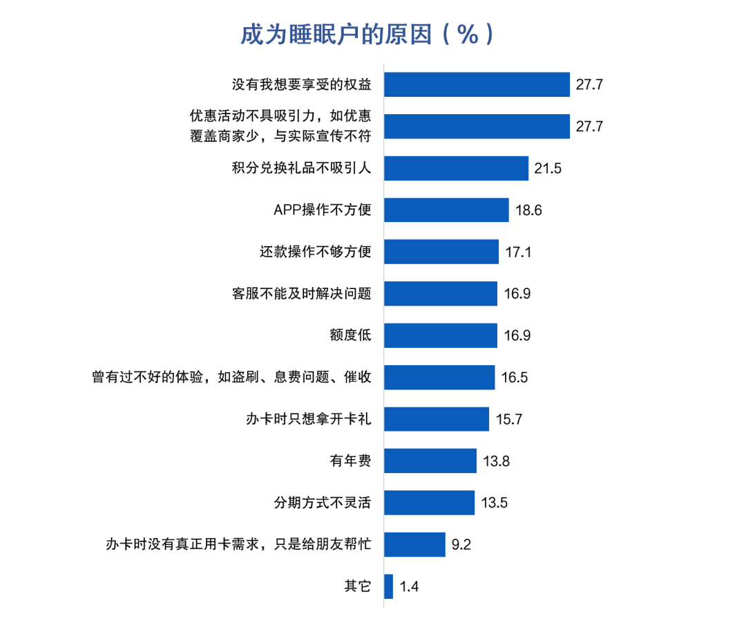 在“成为睡眠户”的原因方面,权益适配度不强(28%)、优惠活动吸引力不足(28%)和积分兑换礼品吸引力不足(22%)位列前三。