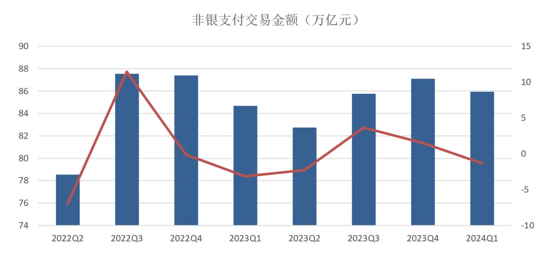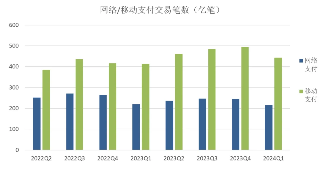 央行发布了《2024年第一季度支付体系运行总体情况》,截止到2024年第一季度末数量为7.6亿张,较2023年末的7.67亿张,环比下降0.91%。连续六个季度持续下降。信用卡授信总额为22.76万亿元,环比增长0.42%;信用卡应偿信贷余额为8.54万亿元,环比下降1.74%。信用卡卡均授信额度2.99万元,授信使用率37.51%。信用卡逾期半年未偿信贷总额1096.76亿元,环比增长11.76%,占信用卡应偿信贷余额的1.29%,首次突破千亿元大关,信用卡业务风险问题不容小觑。*信用卡逾期半年未偿信贷总额指信用卡未足额归还最低还款额,且逾期期限为181 天(含)以上的未清偿本金余额,不包含已核销金额。网络支付业务215.85 亿笔,环比下降11.94%,金额 680.11万亿元,环比下降4.39%;移动支付业务443.32 亿笔,环比下降10.24%,金额 152.07 万亿元,环比增长13.43%。非银行支付机构处理网络支付业务3114.19亿笔,环比下降4.76%;金额85.93万亿元,环比下降1.32%。*非银行支付机构处理网络支付业务量包含支付机构发起的涉及银行账户的网络支付业务量,以及支付账户的网络支付业务量。自 2023 年 1 月起,人民银行修订后的《非银行支付机构支付业务数据统计口径(试行)》正式实施,将转账业务统一纳入统计,并对支付机构间合作业务去重。