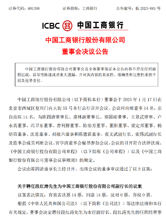 1月17日公告,中国工商银行股份有限公司(以下简称“工商银行”)审议通过了《关于聘任段红涛先生为中国工商银行股份有限公司副行长的议案》,同意聘任段红涛先生为工商银行副行长。段红涛的任职经董事会审议批准后,须报中国银保监会核准。