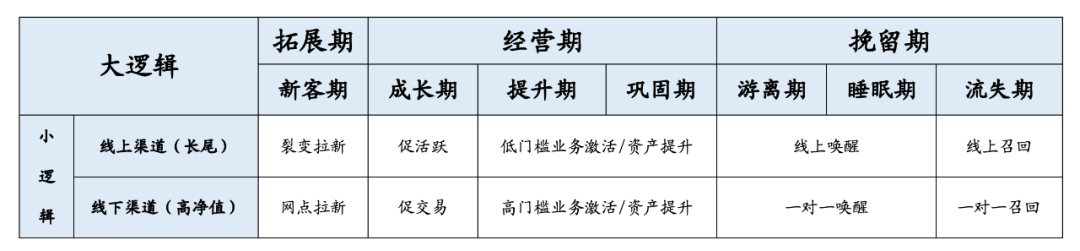 在有了客户生命周期“大逻辑”之后,就需要结合渠道特点来匹配相应的“小逻辑”,下表以线上渠道和线下渠道作为小逻辑来举例说明。