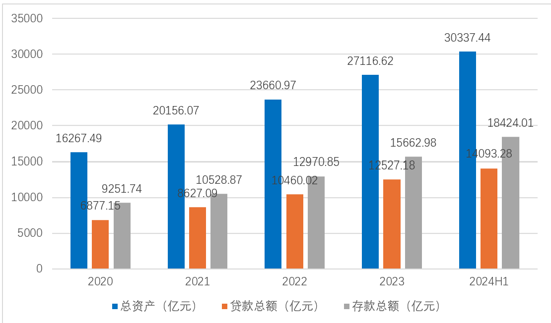 图1:宁波银行2020—2024H1总资产、存贷款总额情况