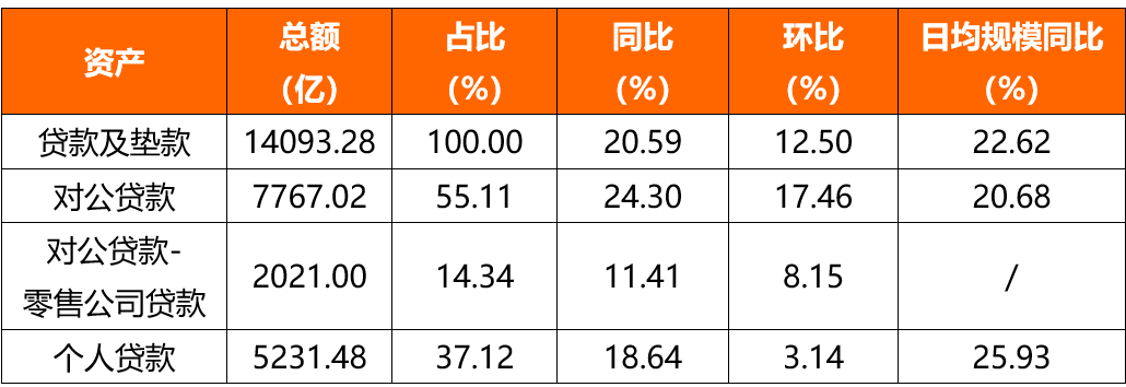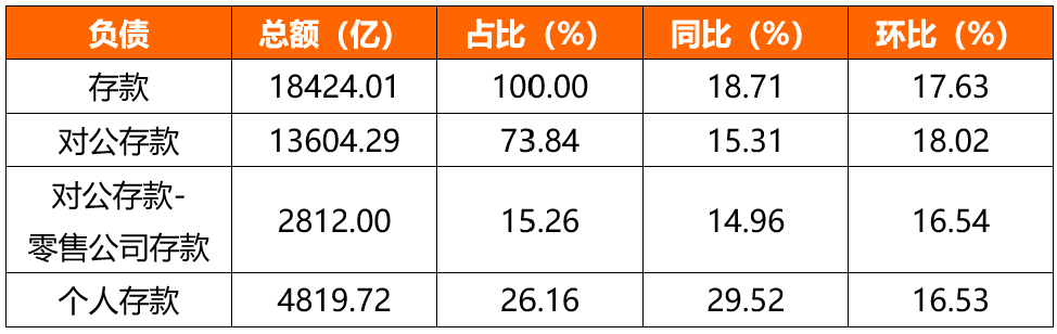 从负债结构看,存款增长主要由个人存款和对公存款共同拉动,两者同比及环比增速均为15%以上。