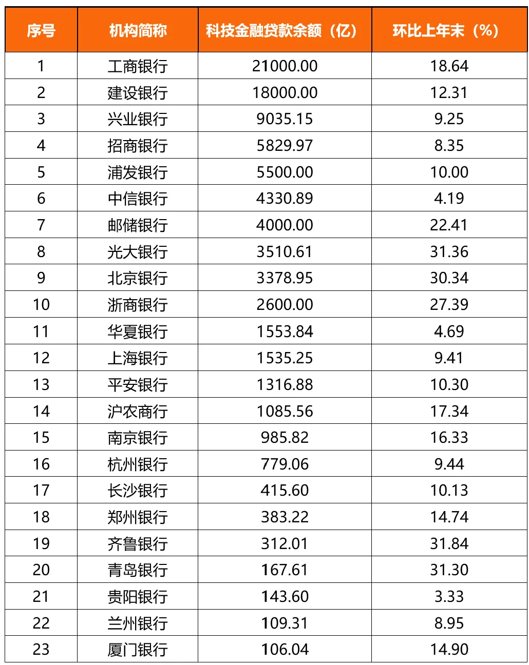 9月初“推动高质量发展”系列主题新闻发布会上,央行信贷市场司司长彭立峰表示,过去5年,我国科技型企业贷款的年均增速是20%,是贷款平均增速的近2倍。样本银行中,上半年环比增速达20%的共6家,为齐鲁银行、光大银行、青岛银行、北京银行、浙商银行、邮储银行。