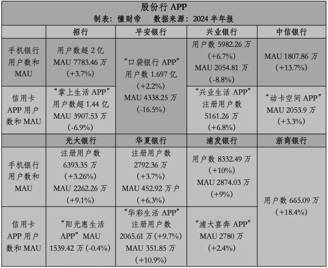股份行“领跌”。招行、平安银行、光大银行的信用卡APP的MAU分别减少了290万、855.4万、6.75万,兴业银行的手机银行APP,MAU减少了197.81万。