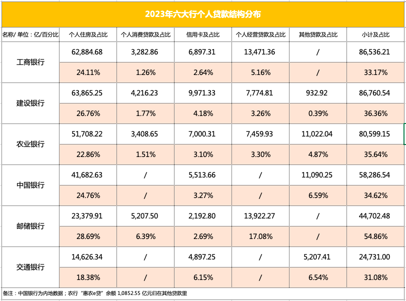 六大行的个人贷款主要由住房、消费贷、信用卡、经营贷等构成,2023年六大行累计发放个人贷款38万亿元左右,较上年末增长2万亿左右。各家均有所增长。