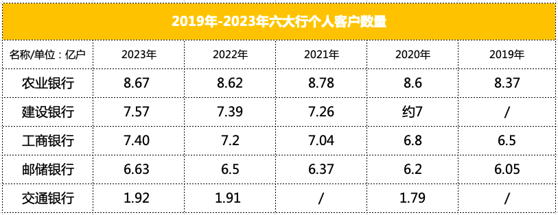 邮储银行和交通银行个人客户数分别增长1.54%和0.53%;中国银行个人客户数量为5.25亿户。