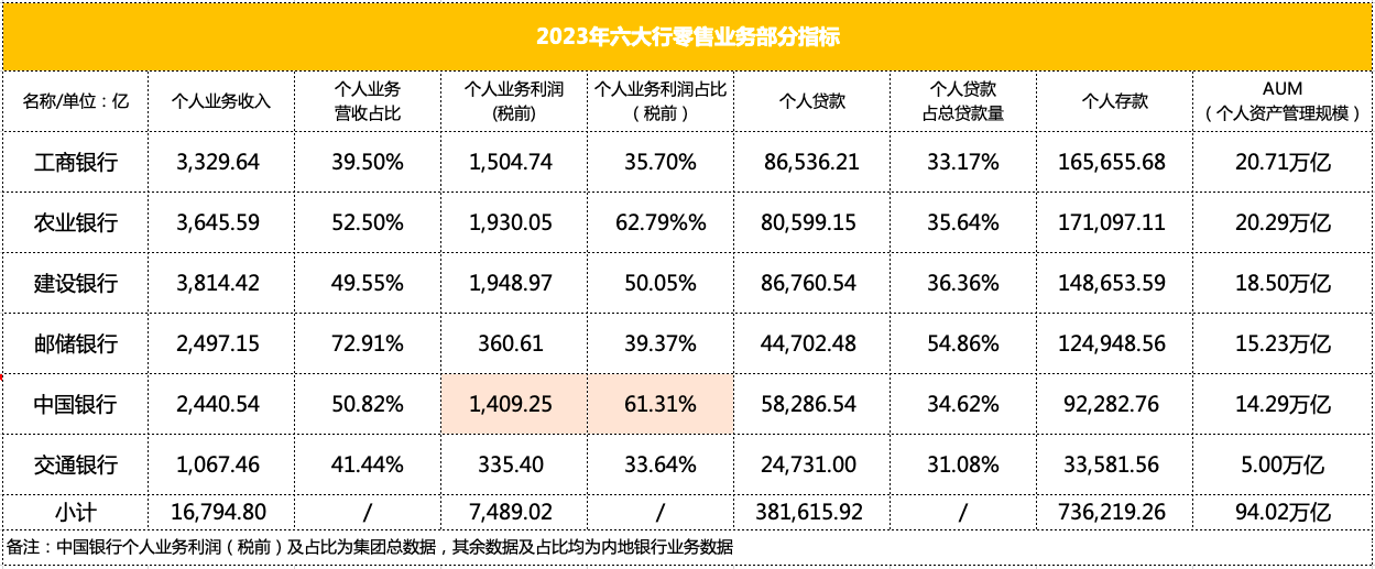 2023年,六大行个人业务收入16,794.8亿元,较2022年下降5.88%,税前个人业务利润总额为7,489.02亿元,较2022年下降4.86%。