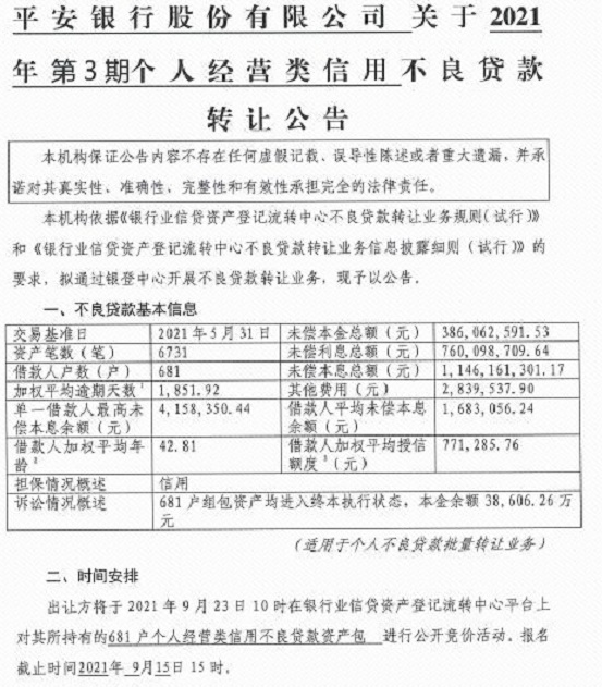 在尝到了转让个贷不良资产包的甜头之后,平安银行又迅速打包了三个资产包即将于第四季度上线竞拍,整体规模达到6.9亿。平安银行于今年相继转让了几个个贷不良资产包,而此能否影响该行2021年不良率走向,值得期待。