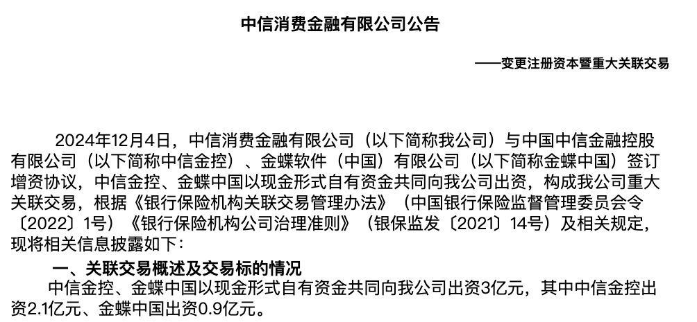 同时,中信消费金融公司也发布公告称,已经与其股东中国中信金融控股有限公司(以下简称“中信金控”)、金蝶软件(中国)有限公司(以下简称“金蝶中国”)签订了增资协议。