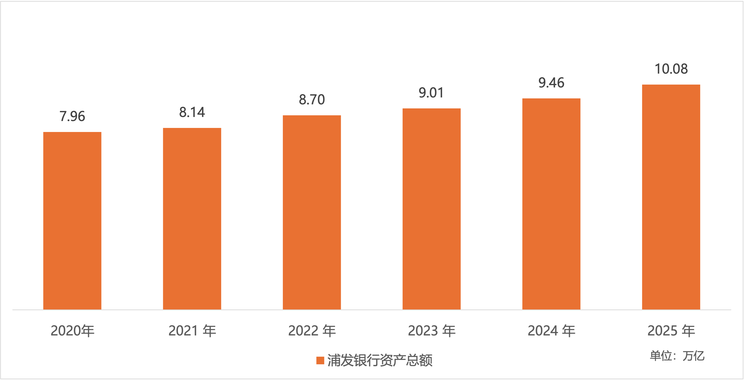 截至2025年末,浦发银行资产总额达到100,817.46亿元,较上年末增长6.55%;近六年资产总额持续稳健增长,如今首次突破十万亿大关,也预示着股份行梯队分化正在明显加剧。