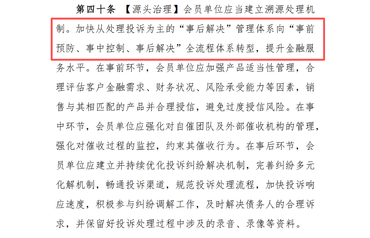 第四十条 【源头治理】会员单位应当建立溯源处理机制。加快从处理投诉为主的“事后解决”管理体系向“事前 预防、事中控制、事后解决”全流程体系转型,提升金融服 务水平。在事前环节,会员单位应加强产品适当性管理,合 理评估客户金融需求、财务状况、风险承受能力等因素,销售与其相匹配的产品并合理授信,避免过度授信风险。在事 中环节,会员单位应强化对自催团队及外部催收机构的管理, 强化对催收过程的监控,约束其催收行为。在事后环节,会 员单位应建立并持续优化投诉纠纷解决机制,完善纠纷多元 化解机制,畅通投诉渠道,规范投诉处理流程,加快投诉响 应速度,积极参与纠纷调解工作,及时解决债务人的合理诉求,并保留好投诉处理过程中涉及的录音、录像等资料。