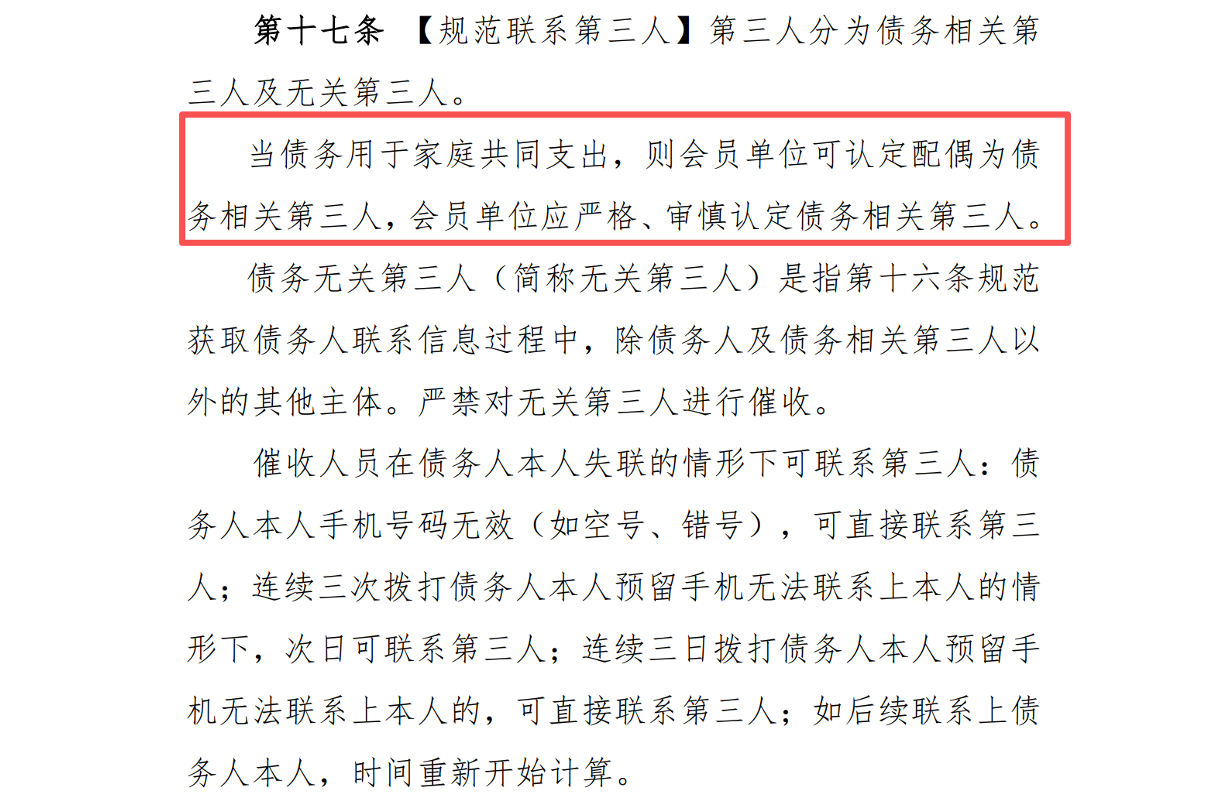 《催收指引》中明确规范了第三人的类别:分为债务相关第三人和无关第三人,当债务用于家庭共同支出时,可认定配偶为债务相关第三人,同时细化债务人失联标准;