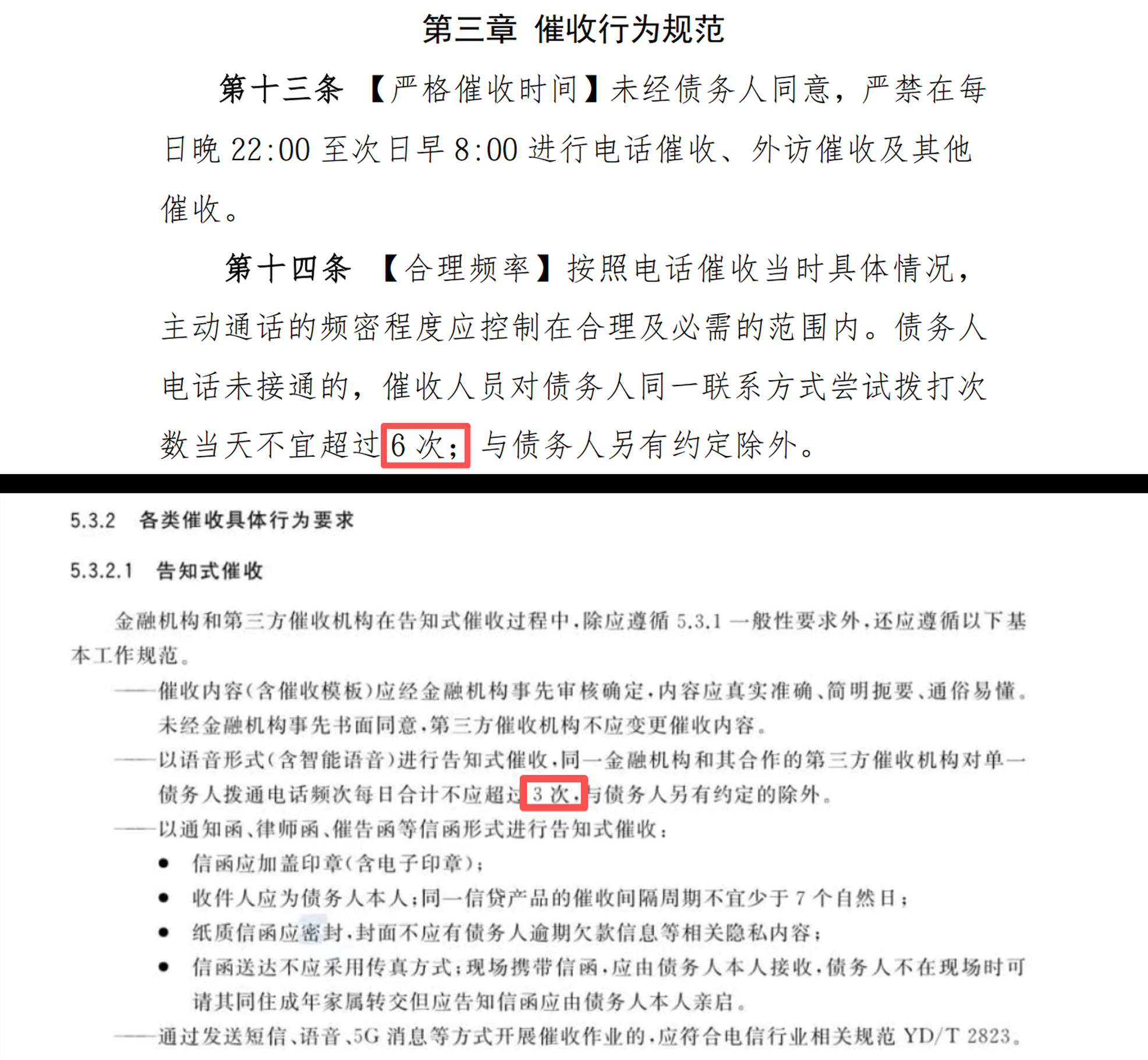 《2026催收指引》中规定,催收人员对债务人同一联系方式尝试拨打次数当天不宜超过 6 次,《2025催收国标》中规定对单一债务人进行语音催收当日不得超过 3 次,现场催收每日不得超过 1 次,约定除外。