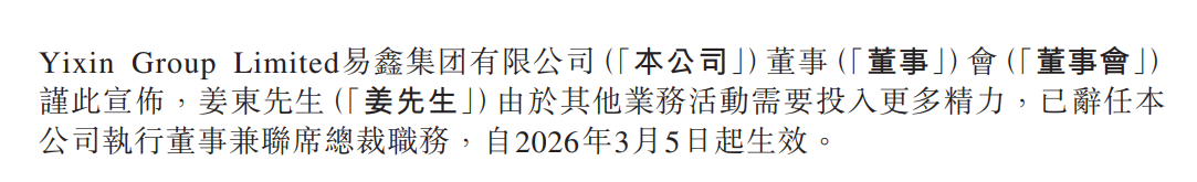 财务数据之外,易鑫还宣布一项重要人事变动:姜东辞任执行董事兼联席总裁职务,结束其在易鑫超过十年的任职。同时,高志(同音)被委任为执行董事兼总裁,3月5日生效。