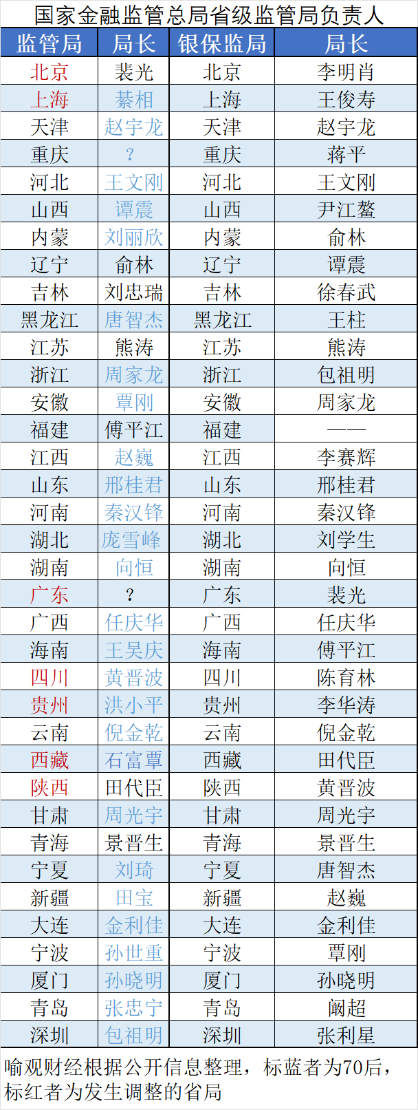 6月以来,金监总局启动了对部分省局一把手的调整。当月,北京、陕西、四川、贵州、西藏五局局长调整,其中,北京局局长杨东宁调任中国进出口银行党委委员、拟任副行长,成为金监总局成立以来,首个“出圈”任职的司局级干部。